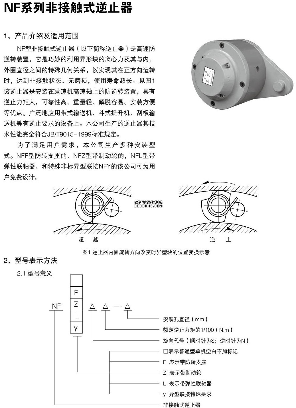 NF型非接觸式逆止器(以下簡稱逆止器)是高速防逆轉(zhuǎn)裝置,它是巧妙的利用異形塊的離心力及其與內(nèi)、外圈直徑之間的特殊幾何關(guān)系,以實(shí)現(xiàn)其在正方向運(yùn)轉(zhuǎn)時(shí),達(dá)到非接觸狀態(tài),無磨損,使用壽命超長。